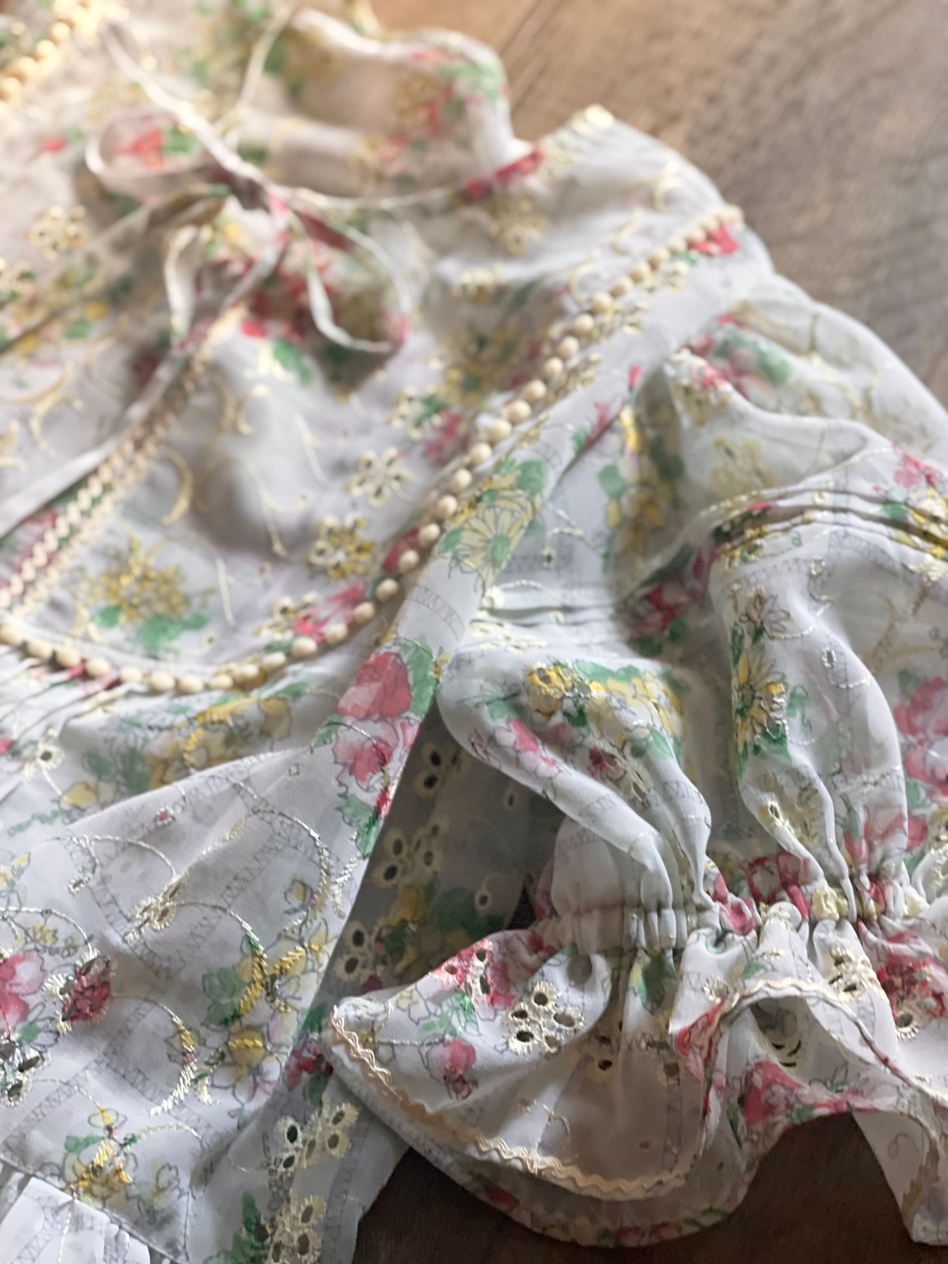 レース刺繍の上にさらにプリントが重ねられた、贅沢な素材です。