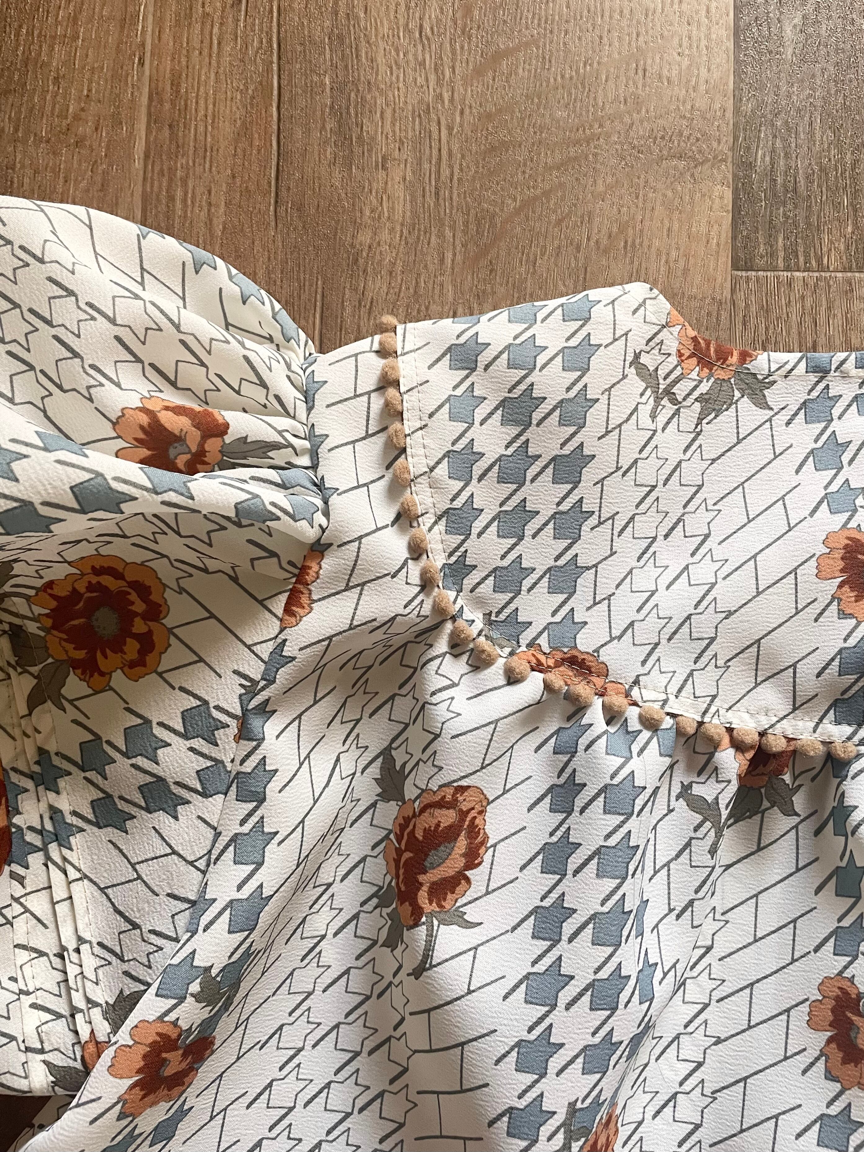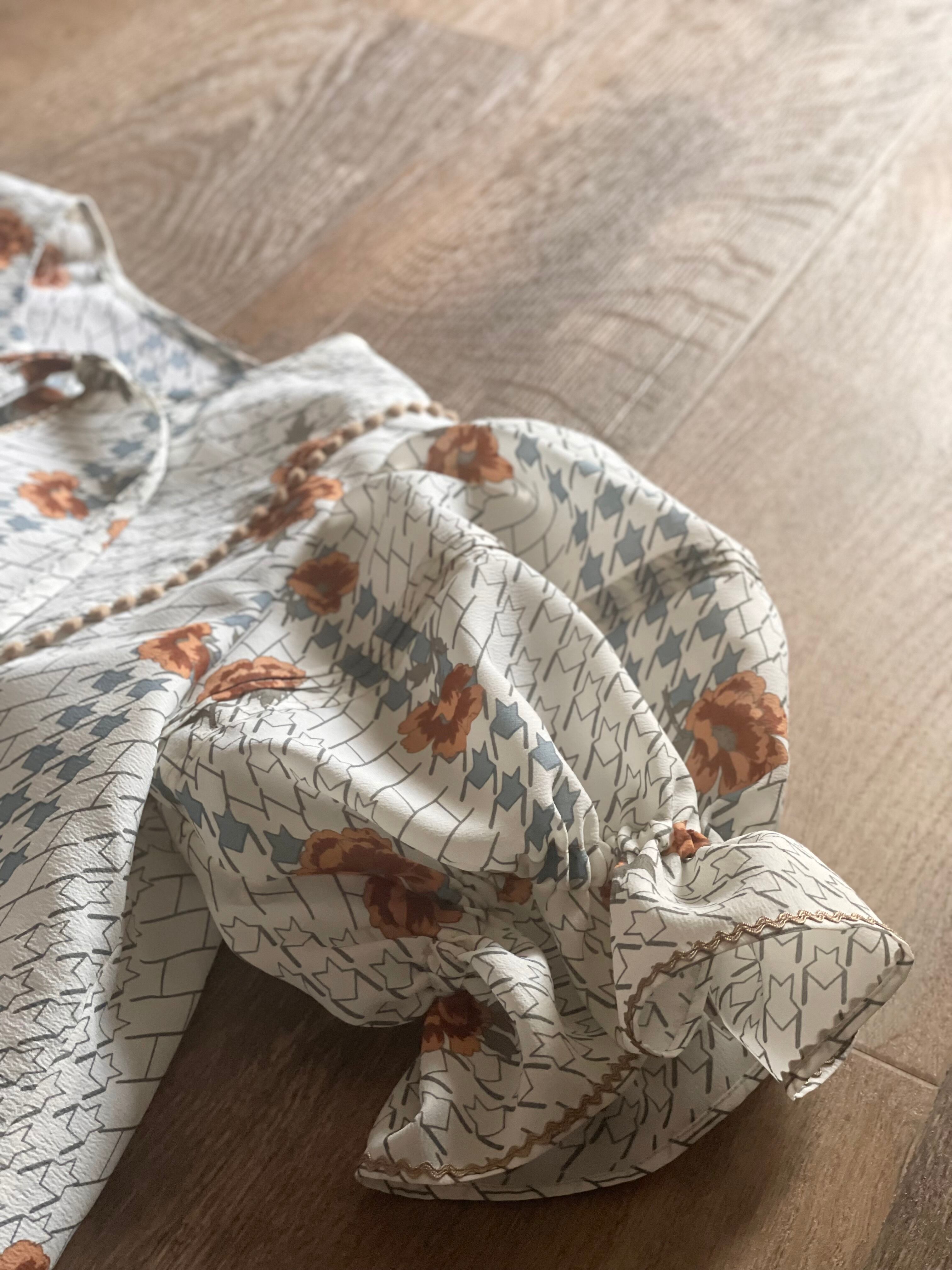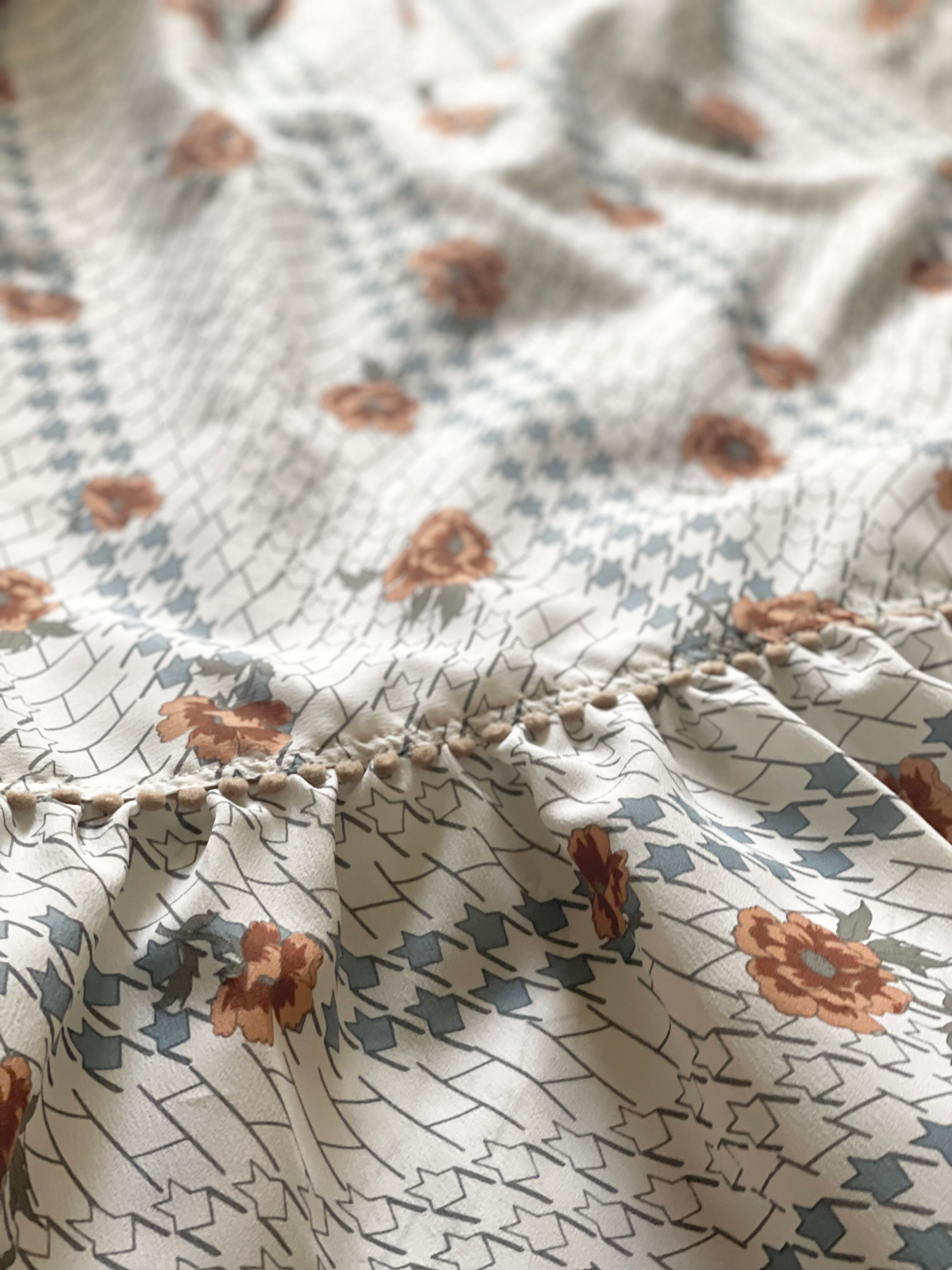 変形千鳥柄の上に舞う大胆な花柄に一目惚れしました。
